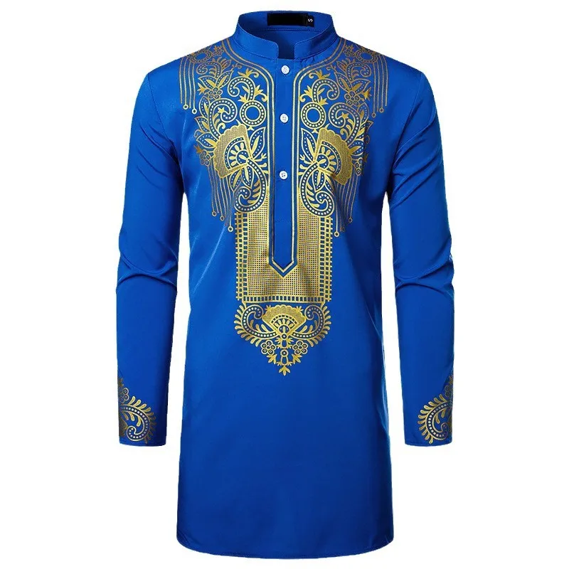 Men’s Islamic Arabic Abaya Robe Ethnic Print Stand Collar Youth Mid-length Shirt Luxury Coat Casual Fashion Muslim Men Clothing